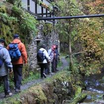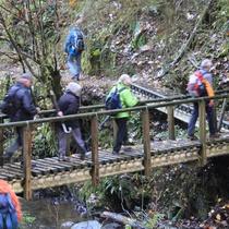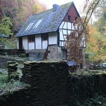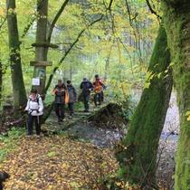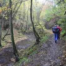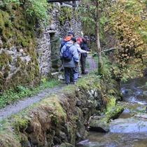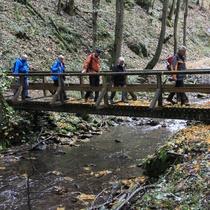 Diese Stärkung kam gerade zu rechter Zeit. Denn nach der Mittagspause verschmälerte sich der Weg zu einem Pfad und es ging weiter über Brücken und Stege, vorbei an verlassenen Mühlen, bergauf und bergab bis die Gruppe gegen 16.00h eine erste Rast in der „Göbels Mühle“ einlegte. Von hieraus war es nicht mehr weit bis zum Etappenziel, der Weißmühle, die sie gegen 17.30 h erreichte.