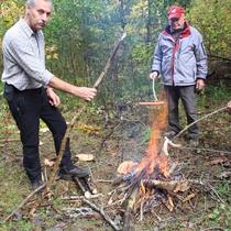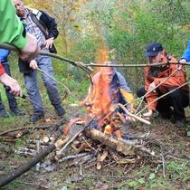 Die Wegstrecke der zweitägigen Wanderung führte durch das Tal der „wilden“ Endert bis nach Cochem an der Mosel. Nach einem Abstecher auf dem Kreuzweg zur Pilgerstätte Maria Martental zum Gruppenfoto wurde die Rucksackverpflegung ausgepackt und zu Mittag gegrillt. Die geübte „Landjugend“ brachte trotz des Dauerregens ein Feuer in Gang und es konnten – wie bisher auf 44 früheren Wanderungen auch – Würstchen am „Stecken“ gebraten werden.